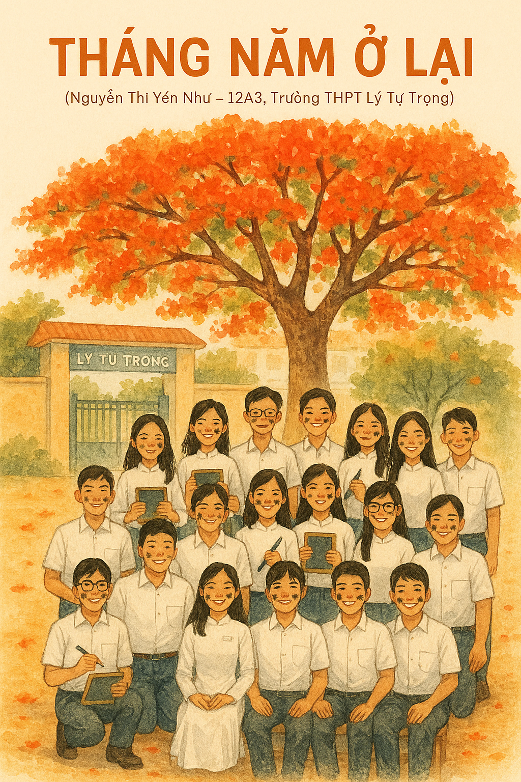 Ngày bế giảng, sân trường vàng rực nắng. Tiếng trống cuối cùng vang lên, dội vào ngực từng người. Những chiếc áo trắng dính đầy chữ ký, những lời nhắn “giữ liên lạc nhé”, “mai mốt đi ăn ma sói tiếp nha”. Tôi ký lên vai bạn, cười mà mắt cay cay. Có ai đó khều khẽ: “Chụp thêm tấm nữa.” Và chúng tôi lại đứng sát vào nhau, trong mùi phấn, mùi nắng, mùi tuổi mười tám không thể nào quên.