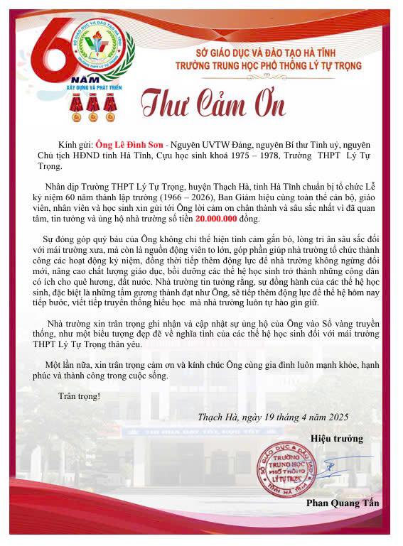 Trường THPT Lý Tự Trọng trân trọng cảm ơn Ông Lê Đình Sơn - Nguyên UVBCH TW Đảng, nguyên Bí thư Tỉnh uỷ, nguyên Chủ tịch HĐND tỉnh Hà Tĩnh, cựu học simh khoá 1975 - 1978 đã đến tham dự buổi phát động và có những chia sẽ hướng đến ngày lễ kỷ niệm 60 năm Thành lập Trường và trao tặng số tiền 20 triệu đồng![]()
